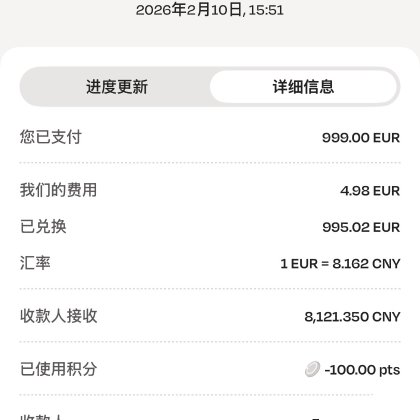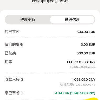 *返现可用于下次人民币汇款抵扣,也可以汇回欧元卡