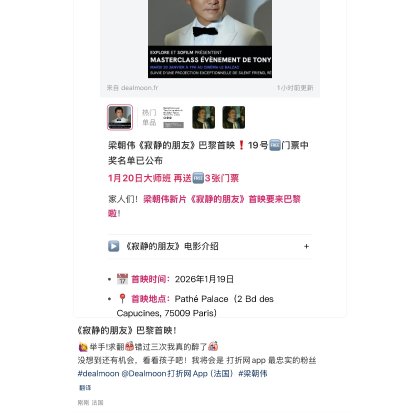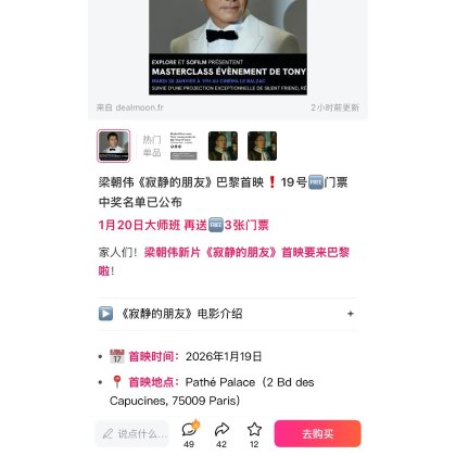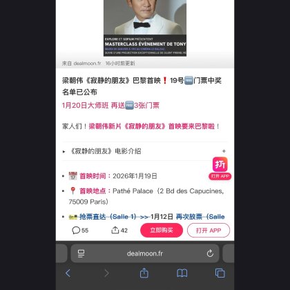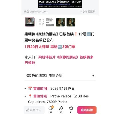 : 恭喜您中奖啦!Dealmoon请你免费去看1月19日梁朝伟《寂静的朋友》电影首映!请添加小编微信号:FRloveDealmoon,回复“19号首映门票领奖”,客服核对后会直接给您发送门票!再次感谢您的积极参与~ 恭喜您中奖啦!Dealmoon请你免费去看1月19日梁朝伟《寂静的朋友》电影首映!请添加小编微信号:FRloveDealmoon,回复“19号首映门票领奖”,客服核对后会直接给您发送门票!再次感谢您的积极参与~