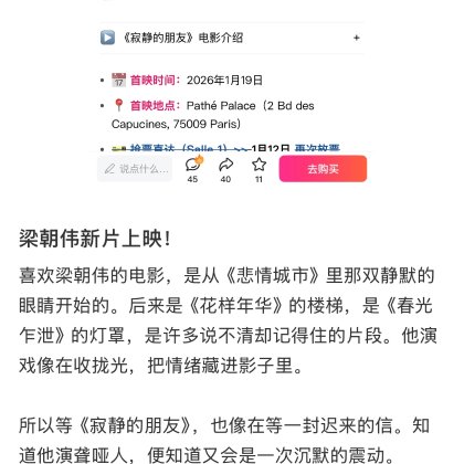 : 以为能抢到大师班把首映票退了两边都没有的人后悔得要跳楼了,真的想看这个电影几个月喜欢梁朝伟好多年了![[流泪]](/assets/emoji/comment-emoji/dm_liulei@2x.png?v=1)