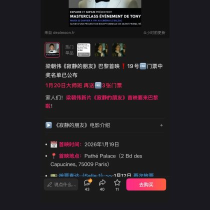 我真的会当打折网的狗 以为能抢到大师班把首映票退了两边都没有的人后悔得要跳楼了,真的想看这个电影几个月喜欢梁朝伟好多年了![[流泪]](/assets/emoji/comment-emoji/dm_liulei@2x.png?v=1)